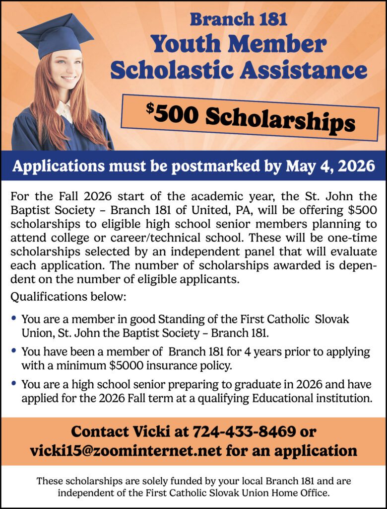 The 2026 Branch 181 Youth Member Scholastic Assistance program is now open. Winners can earn a one-time award of $500. Contact Vicki at 724-433-8469 or vicki15@zoominternet.net to receive an application.