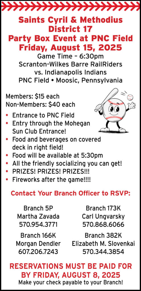 Join us for a Baseball Game and Party Box Event on Friday, August 15, 2025 at PNC Field, Moosic, PA. The Scranton-Wilkes Barre RailRiders will face off against the Indianapolis Indians at 6:30pm. Attendees will gather at the Right Field Party Suite and Covered Deck. Admittance will be through the Mohegan Sun Club Entrance at approximately 5pm.