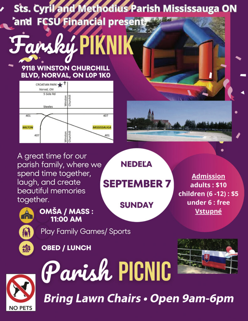 Branch 785 is hosting the annual Slovak picnic on Sunday, September 7, 2025 from 9am to 6pm. Mass will be celebrated in Slovak at 11am. The location is Croation Park, 9118 Winston Churchill Blvd, L0P 1KO on the north of the 5th side Road, Norval, ON. The cost is $10/adult and $5/child (6-12), under 6 years is free. Lunch will be for sale. The admission to the grounds will be free to all members. Contact me at 905-279-8154.