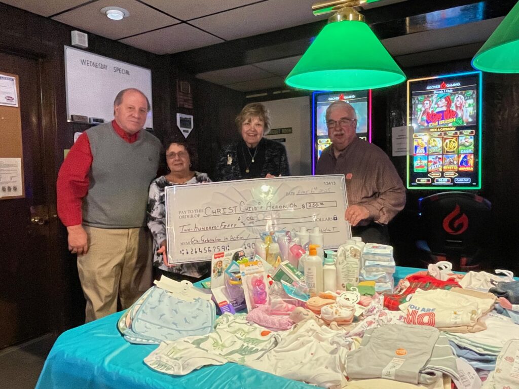 Thanks to the incredible generosity of Branch 553 and District 10 members, donations came pouring in. They gathered hundreds of baby-related items – including diapers, layettes, bibs, blankets, and more. Patty Minrovic, president of The Christ Child Society of Akron and a member of 553, was deeply touched by the outpouring of support. Along with the donated items, District 10 President, Greg Petrasek and Branch 553 President, Debbie Speck, and National President, Ken Arendt, also presented two $250.00 checks to the organization on behalf of the FCSU FIA program. The Christ Child Society of Akron is a nonprofit committed to serving children in need.