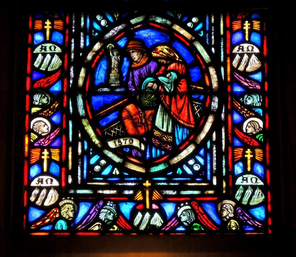 The next window I point out is the window of Slovak history situated on the right in the rear of the Basilica. This window contains the window most central to the issue I want to highlight. Once again in the bottom of the middle lancet we see the first immigrants landing on our soil in 1870. Even though there is no movement in the window one seems to sense what the family must have experienced as they moved forward to Ellis Island with what little they carried with them from their homeland. In the background, however, is a comforting sight, the Statue of Liberty and the words of Emma Lazarus imprinted there, “Give me your tired, your poor, your huddled masses…” Significant also is what is depicted in the panel directly above, the Church of St. Joseph, Hazleton, PA, a spiritual refuge for all who have left their homeland and whose faith will be supported and encouraged in their new home.