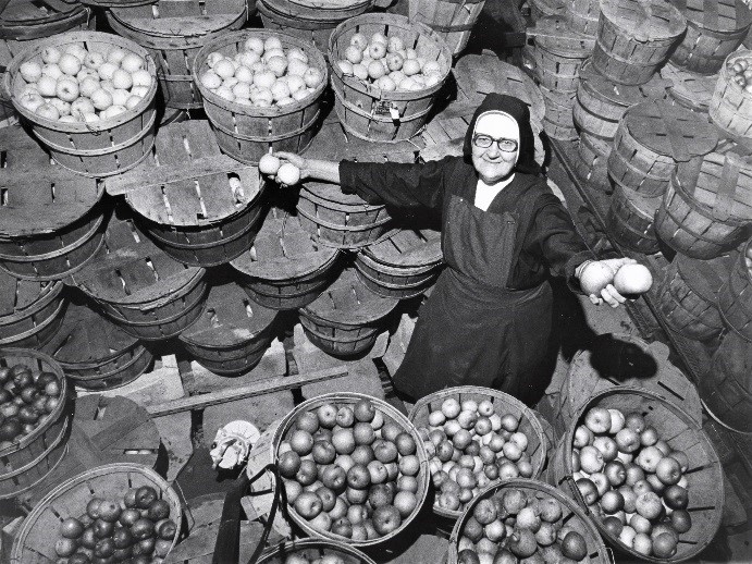 Besides working in the barn, the greenhouse, the vegetable and flower gardens, and tending the grapevines, the Sisters pruned and sprayed the fruit trees, cherry, pear, plum, peach, and of course apple, so that in the fall the Sisters could enjoy delicious apple cider. The apples were harvested on one day, and the next they were pressed, using our own cider press. According to Sandy, there was a time that the apples grown in our orchards were used by an applesauce company.