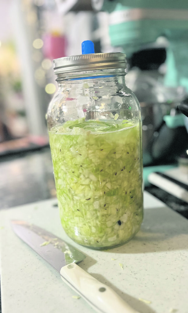 Store the jar in a dark corner of your kitchen or pantry, allowing it to ferment for 1 to 4 weeks. Stir occasionally. The longer it ferments, the richer the flavor and the greater the bio-availability of nutrients. Enjoy your homemade fermented sauerkraut—packed with gut-friendly probiotics that support digestion and boost immunity!